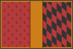 Parti de gueules, semé de mouchetures d'hermine de sable, et losangé d'or et de sable, à la fasce d'or brochante