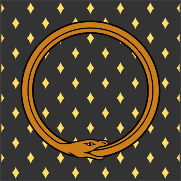 D'hermine de sable semé de pointes d'or, chargé d'un ouroboros d'or.